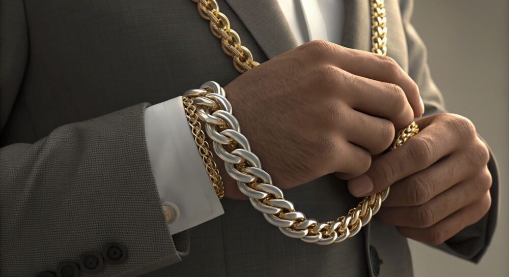 - Массивные цепи: Объемные, часто выполненные из желтого или розового золота, а также из стали. Становятся главным акцентом образа.
