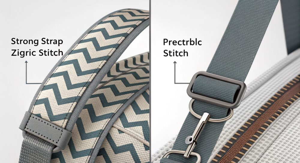 Защита края: Зигзагообразная строчка эффективно обрабатывает края стропы, предотвращая их расплетание и истирание.